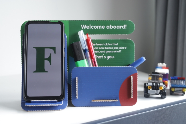 While Forest Interactive designed the starter kits to be fun (and green), it is also about ensuring that new talents have useful items for their everyday work. The starter kits include a foldable canvas bag, universal charging cable, stress ball, fidget cube, lanyard, and stickers. The branding team shares that the decision-making in coming up with the contents of the box entailed a mix of minds from different departments, as well as a focus group discussion from new employees to ensure that the items are not just useful, but also in support of mental health campaigns—an advocacy that was heightened especially during the lockdowns.