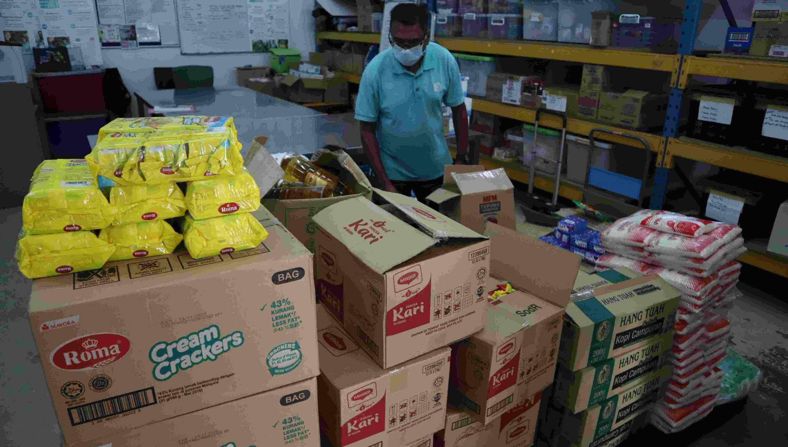 Volunteers gather at the TLFP warehouse to pack essential food items before distribution to the PPR Gombak residence.